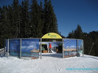 Az egyik sípálya tetejére telepített napozó szélfogója tengerparti képekkel, hááát…érdekes.
