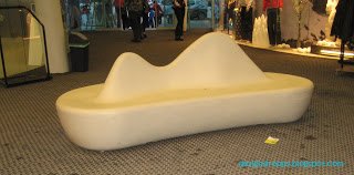 A havas hegygerincet imitáló műanyag pad már sokkal jobb választás a sípálya központi épületében.