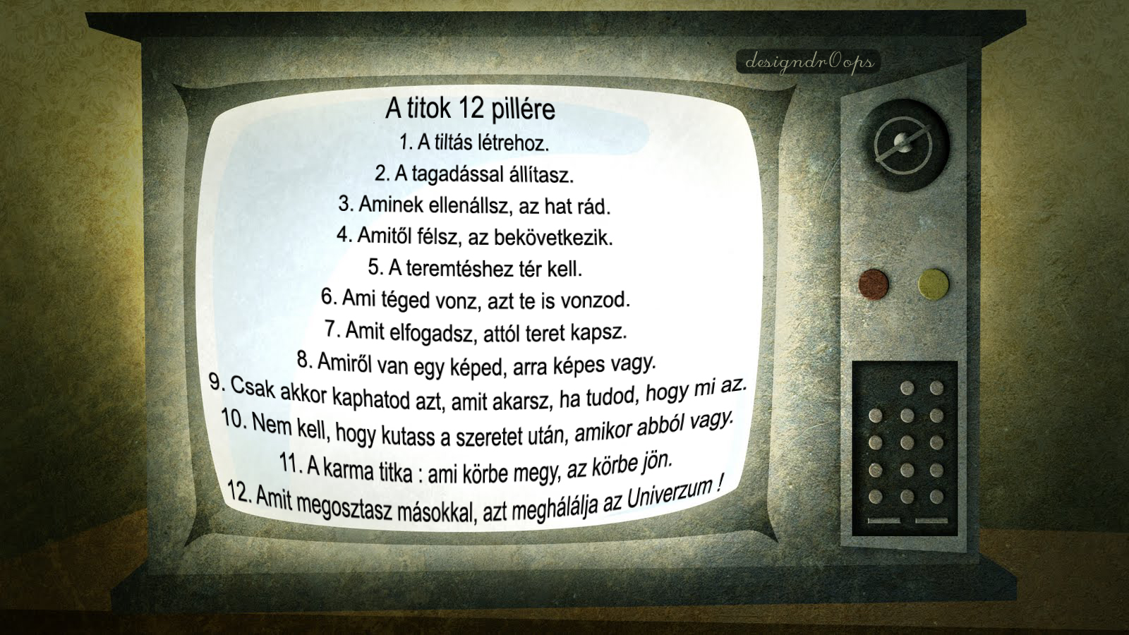 A titok 12 pillére Takáts Lilla2013-07-11Hozzászólások (0) Oldal ajánlása emailben X Címzett: Feladó: Üzenet: Ajánlott bejegyzések X Vannak dolgok, amiket nem lehet megbocsátani! - 2017-02-27 Felhők alatt - 2017-01-15 Kucorgók az ablakban - 2017-01-08 Kövess minket a FACEBOOK-on is designdrOops! Hasonló bejegyzések A boldogság 9 szobája avagy életünk szimbolikus helyiségei Hol kezdődik a giccs? Így készíts magadról avatart Waterdream Ray Caesar szürreális világa