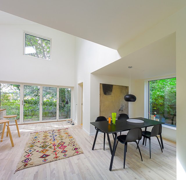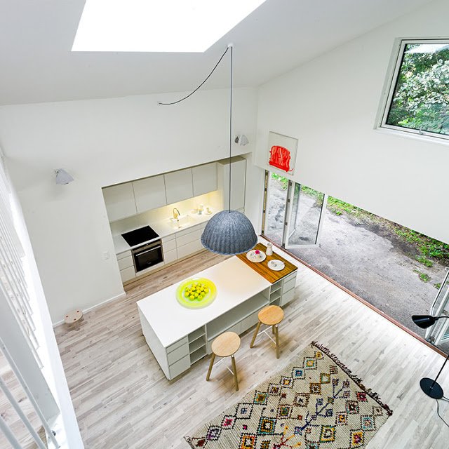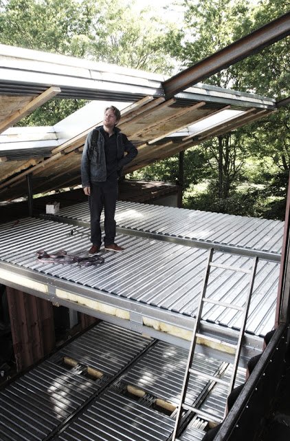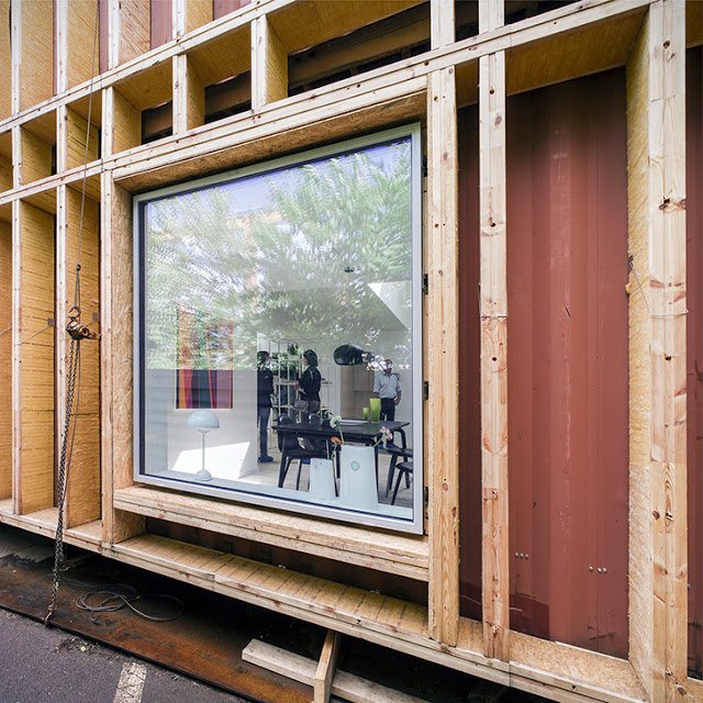 Ennek a háznak a vázát – szinte hihetetlen – kiszolgált hajókonténerek adják. A tervező fantáziáján múlik, hogy mint a gyerek az építőkockákat, hogyan rakja, fordítja őket. Egy-két kötőelem és átfedés, nyílások kivágása, amiből később ablak és ajtó lesz, majd a megfelelő külső és belső szigetelés – benne persze az épületgépészeti vezetékek elvezetése – és már jöhet is a burkoló és a nyílászárós…és persze a lakberendező. Pikk-pakk. 🙂